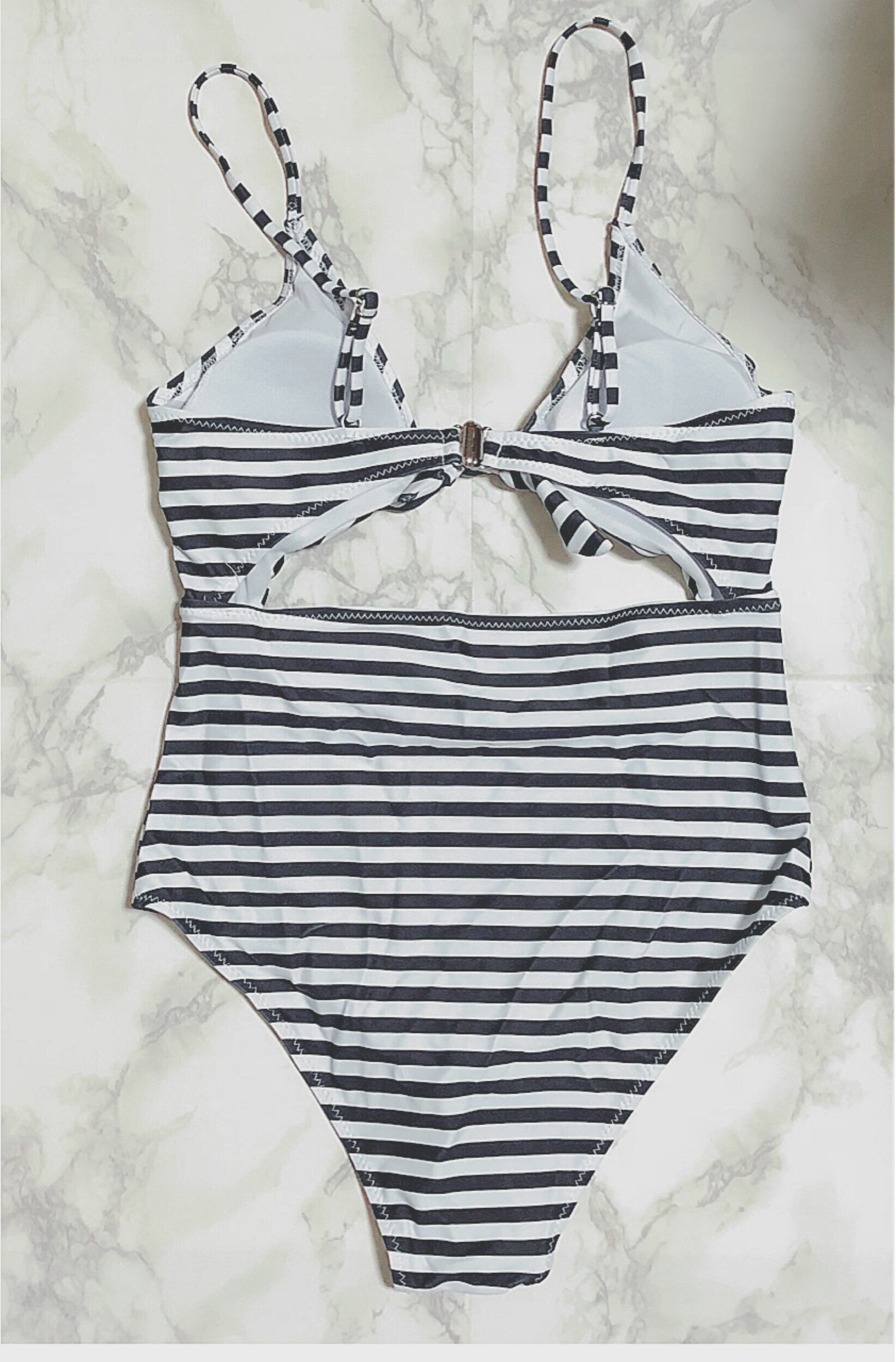 こちらプチプラ・ハイウエストのカットアウトボーダーモノキニビキニです。