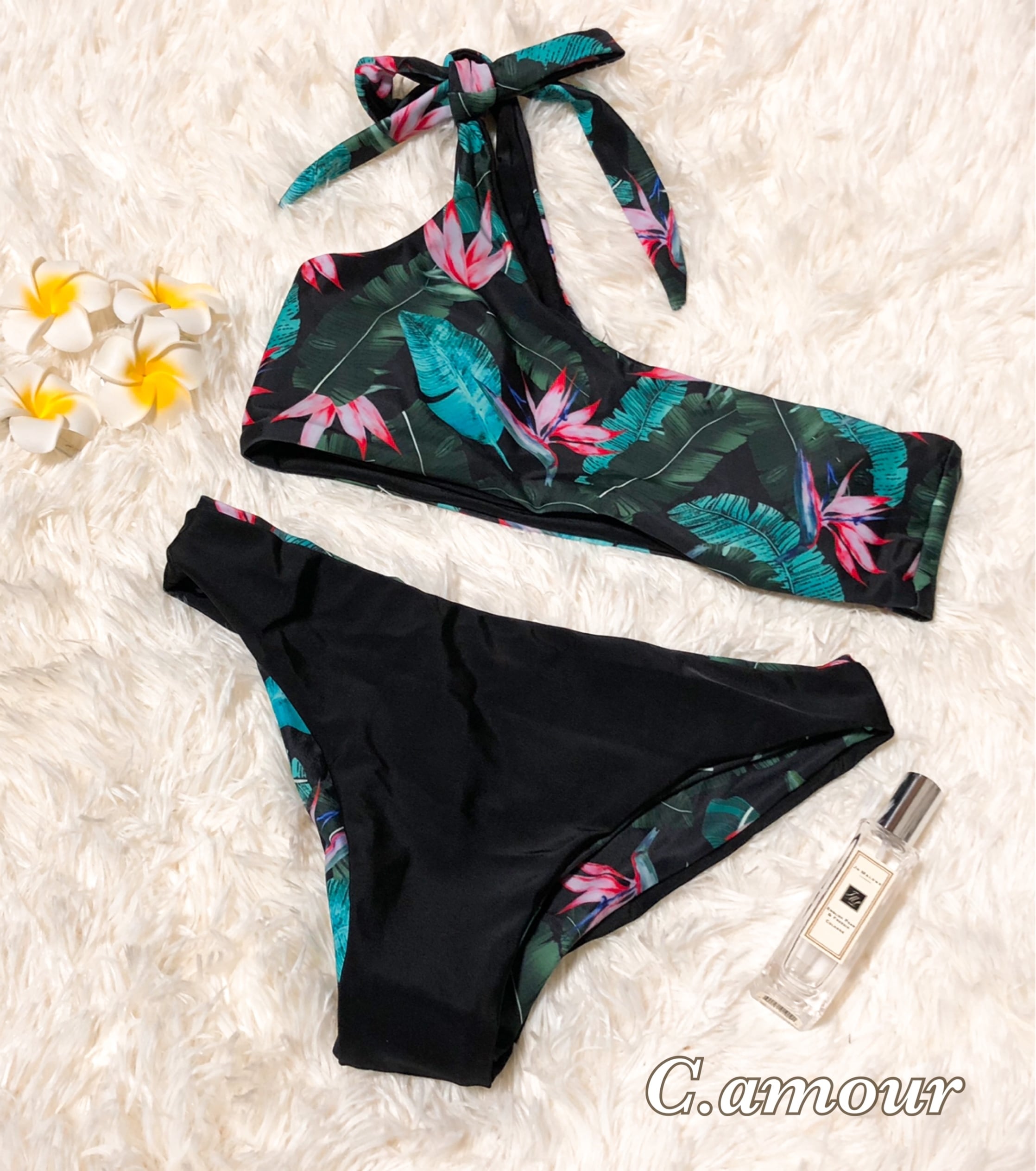S220☆リーフ柄ワンショルダービキニ ブラック